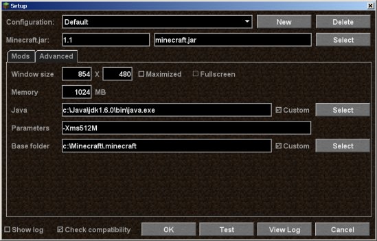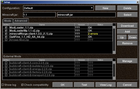 А начнем мы с верхних кнопок, там мы можем задать какую конфигурацию мы будем использовать, так же можно создать новую. Ну, думаю, тут нет ничего сложного. Далее есть 2 вкладки: mods и advanced. Сейчас нас интересует первая, в ней вы можете выбирать какие модификации будут использованы в нашей конфигурации (ВНИМАНИЕ!! Лаунчеру будет проще, если вы будите использовать абсолютно ванильную версию Minecraft’a в корне которого (minecraft.jar) ЕСТЬ папка META-INF) Для того что бы выбрать модификацию , нужно нажать на кнопку «Add», и указать директорию мода (или архив). Мод может быть расположен где угодно. Далее мы можем изменить порядок установки/загрузки модов, используя кнопки «Up» и «Down». Самым «верхним» модом, должен быть загрузчик модификаций (то бишь Forge или MODLOADER) а ниже модификации для игры. Далее идет список с названием External mods/внешние моды, т.е. модификации, которые находятся в самом корне игры (minecraft.jar ) или в папке mods, которую создает Forge. Можно отключить или включить их, поставив галочку перед «External mods». С вкладкой «Mods» мы разобрались, далее переходим на вкладку «Advanced».