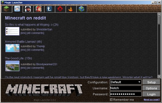 При запуске этого лаунчера, сразу бросаются в глаза несколько новых вкладок сверху: Официальные новости игры , твиттер Нотча, Джеба и Dinnerbone, новости с официального сообщества игры (то бишь minecraftforum) и полезные ссылки на вики Minecraft’a.