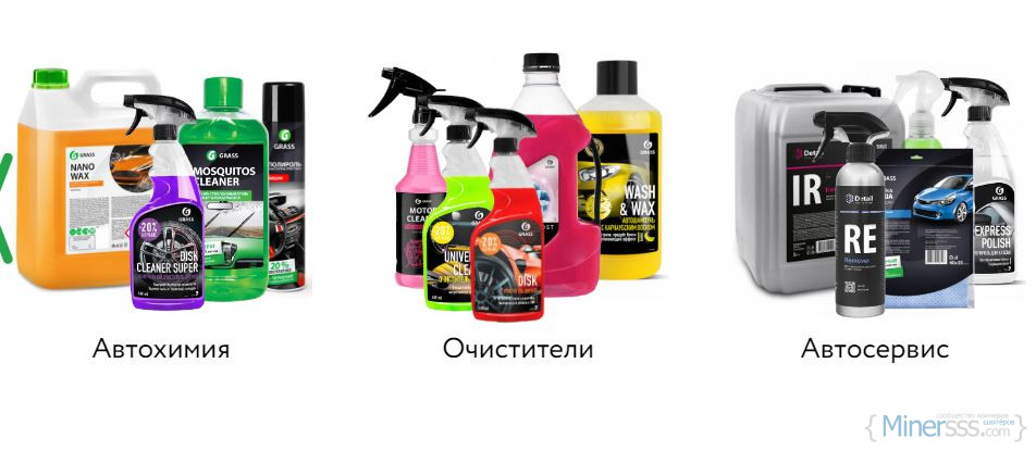 - Автомобильная химия. В категории представлена пена для моек самообслуживания, средства для ручной мойки, удаления пятен, очистки фасада. Можно приобрести очистители кузова, салона, стекол, дисков и т.д.